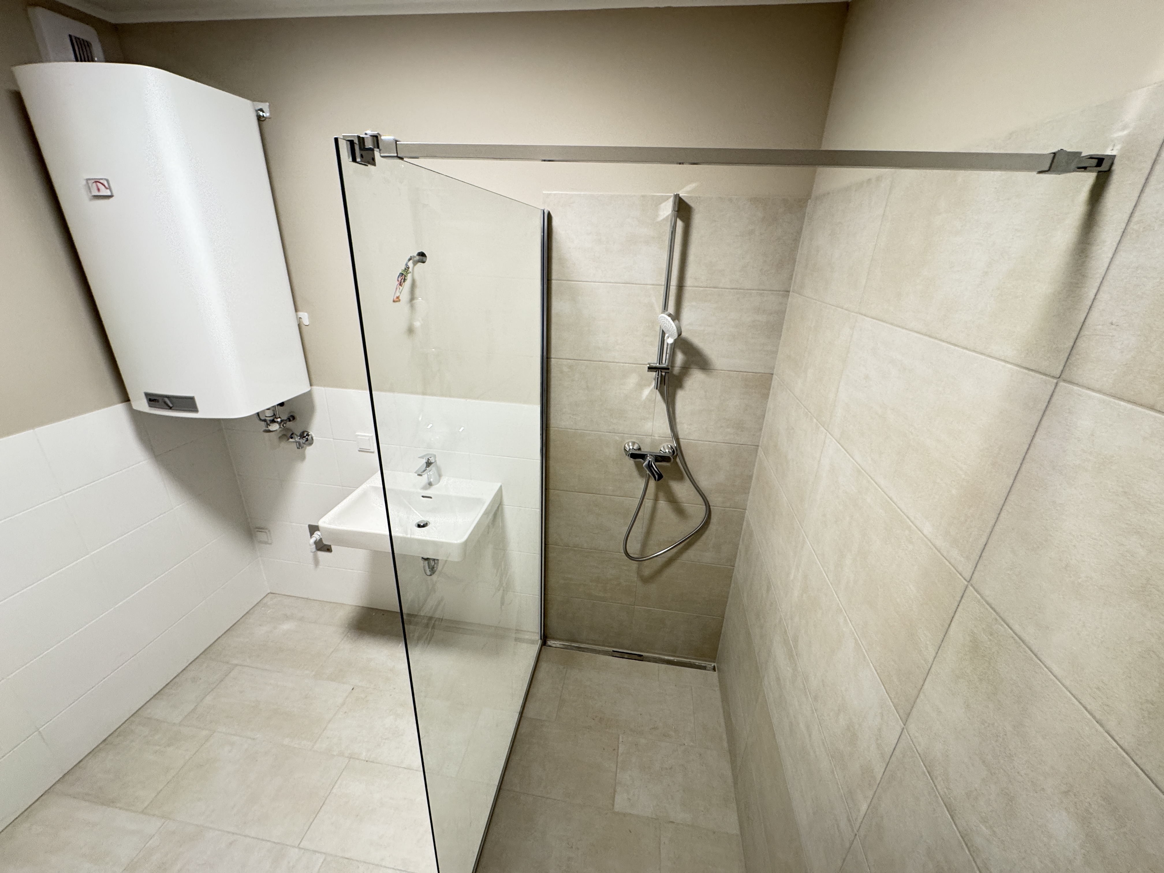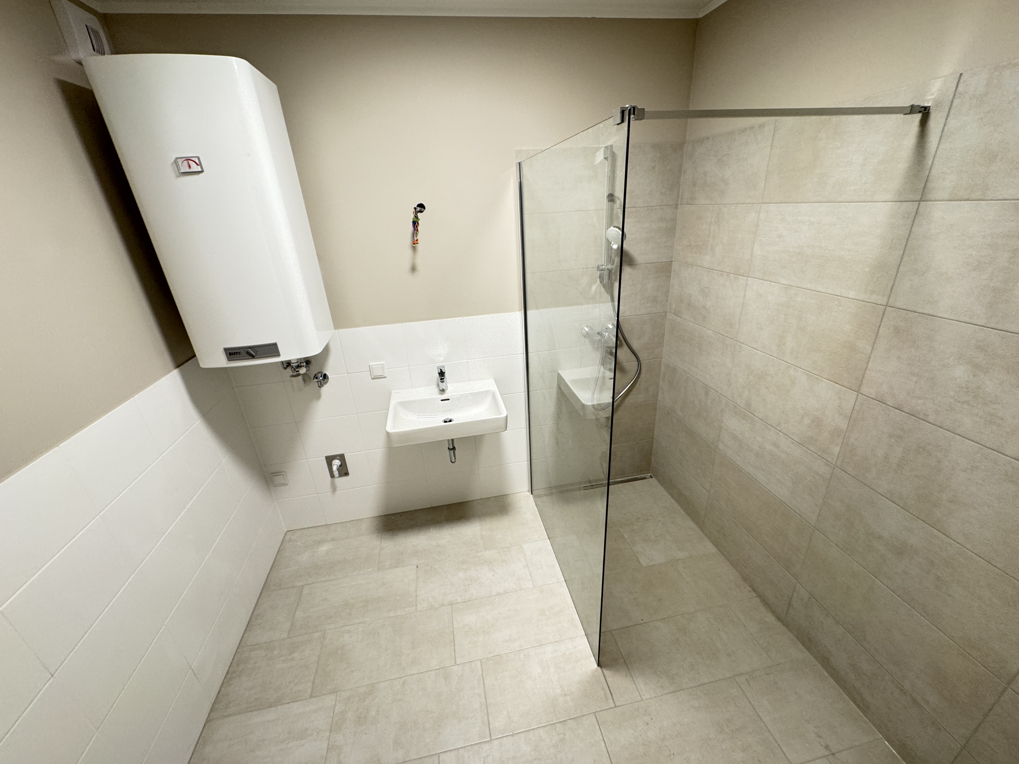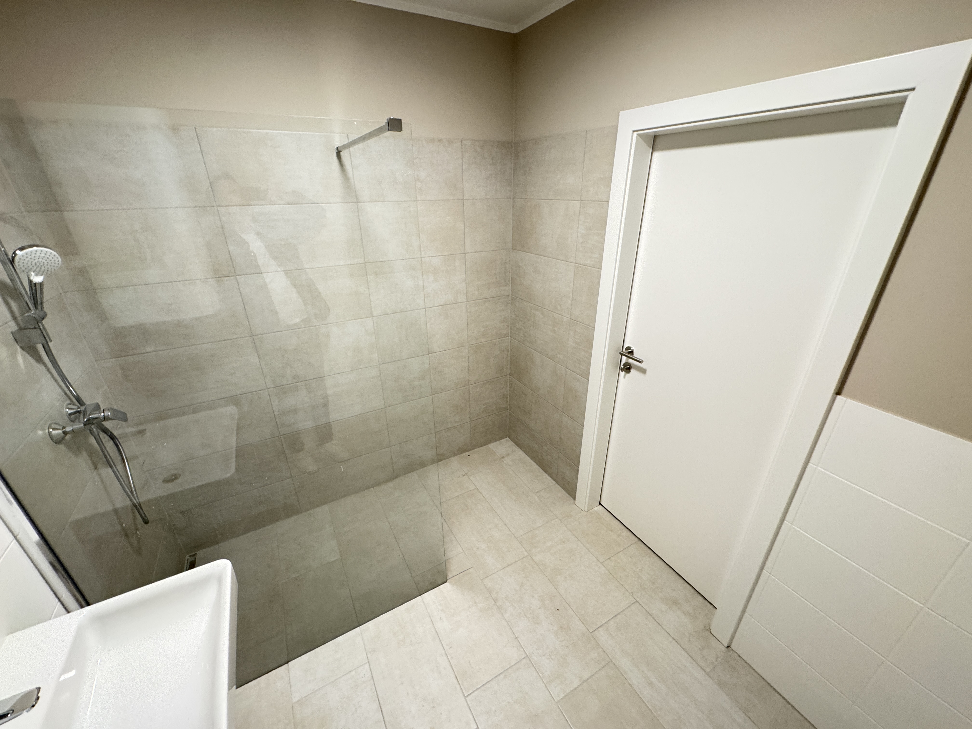 Das Badezimmer ist modern und funktional ausgestattet. Es verfügt über eine große Dusche, hochwertige Sanitäranlagen und stilvolle Fliesen. Hier finden Sie ebenfalls Platz für eine Waschmaschine, was zusätzlichen Komfort bietet.