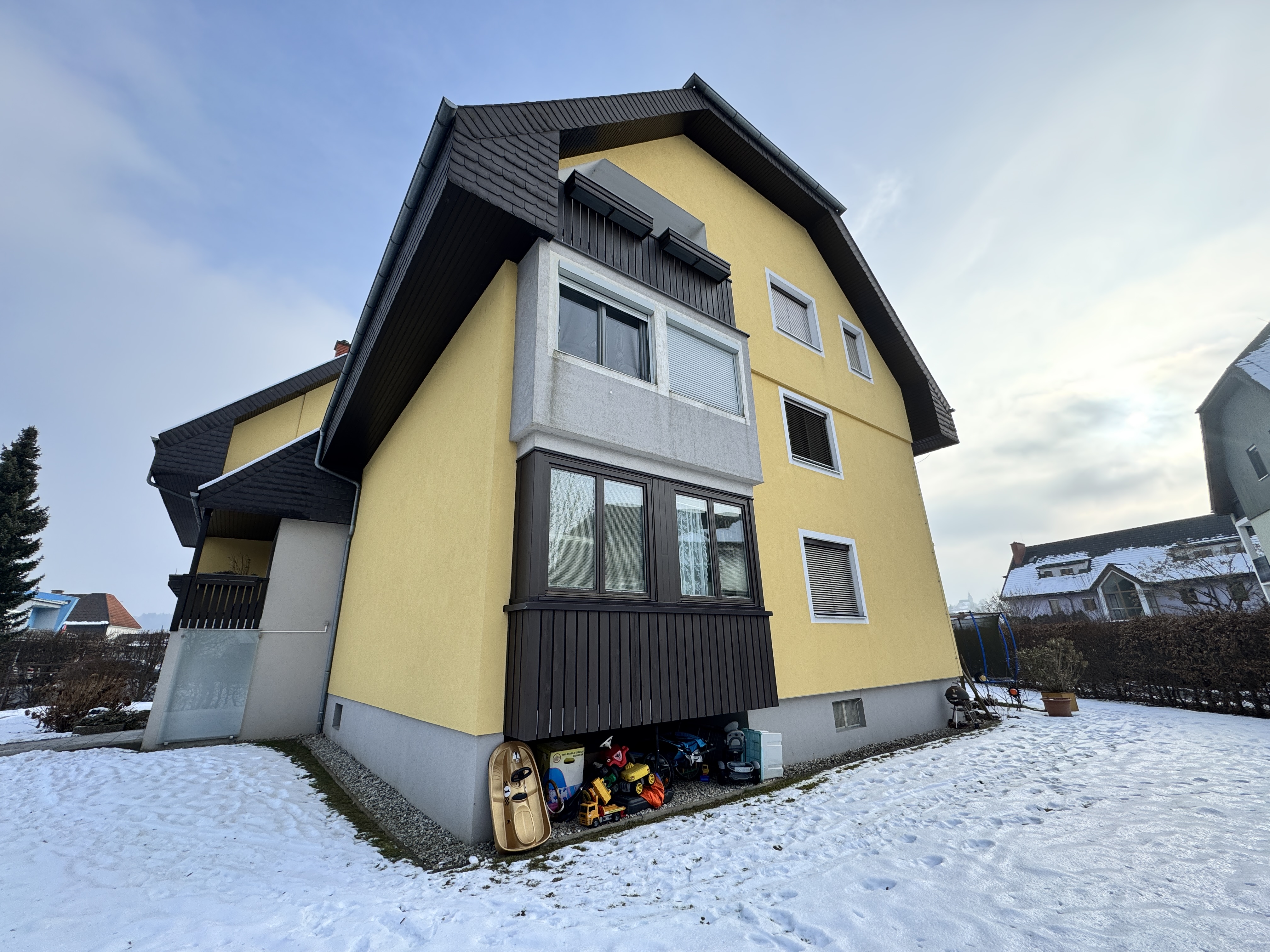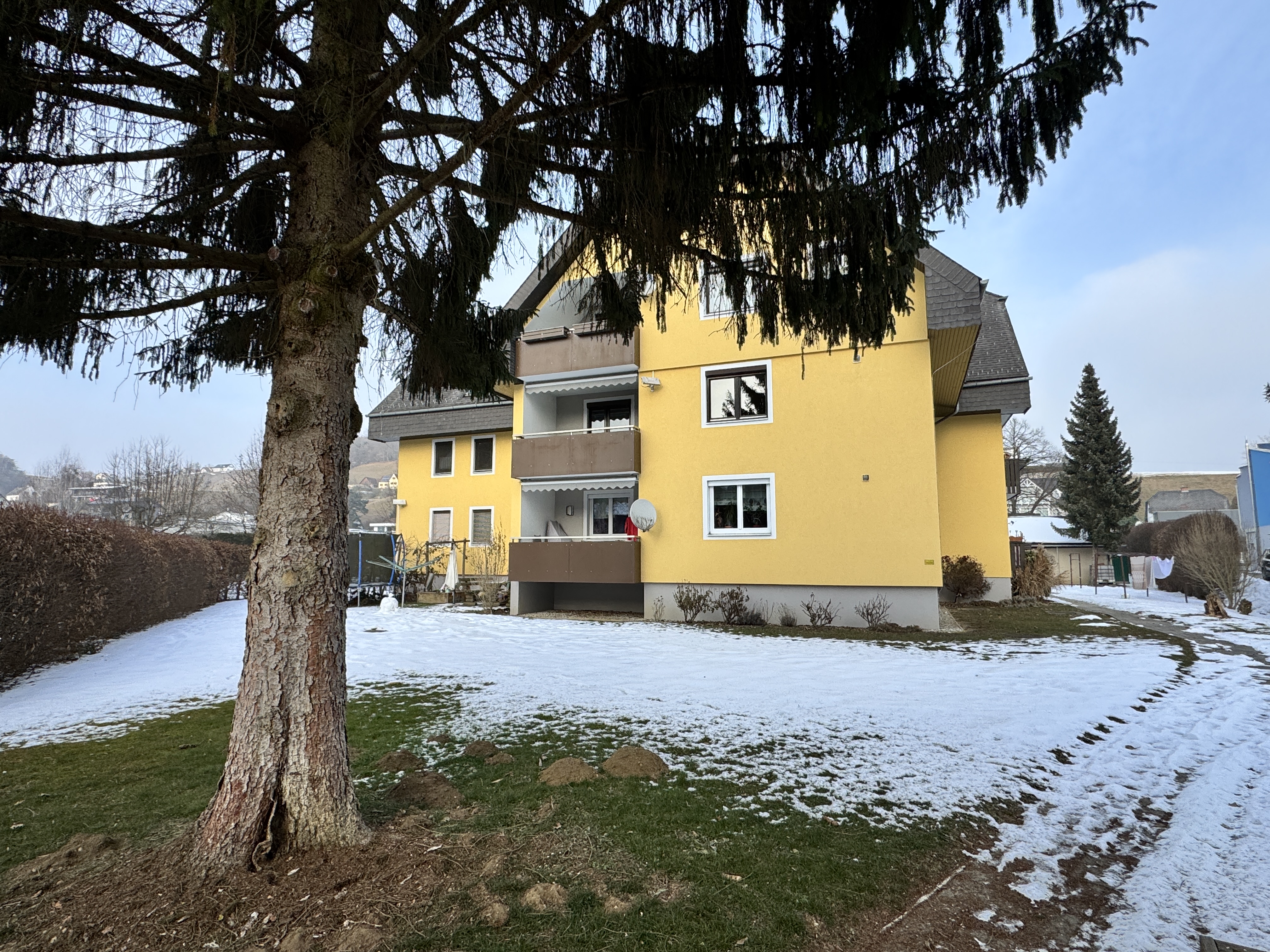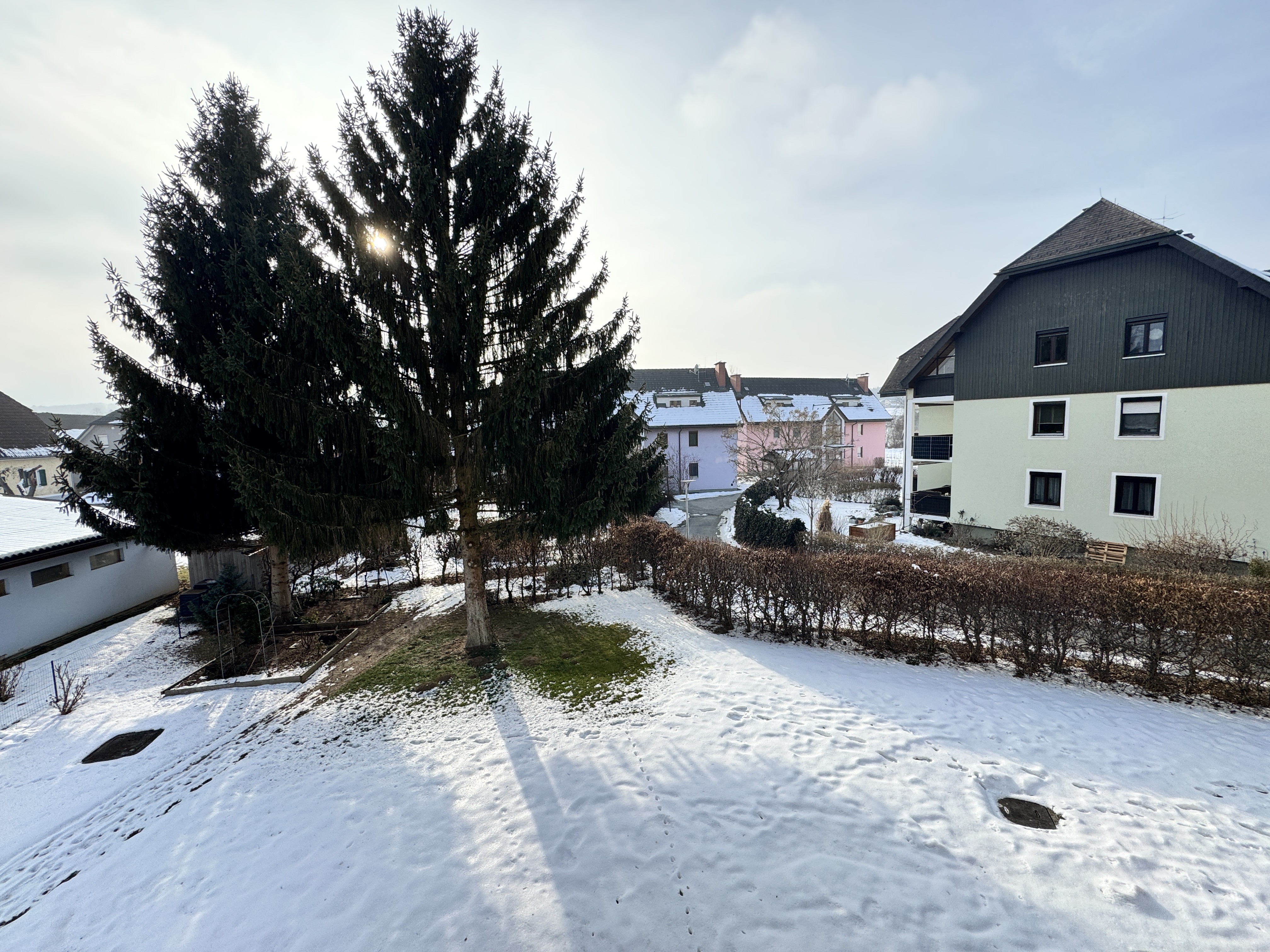Die Wohnung befindet sich in 8082 Kirchbach, eingebettet in eine ruhige Wohngegend mit einem beeindruckenden Grünbereich von insgesamt 1.261 m².