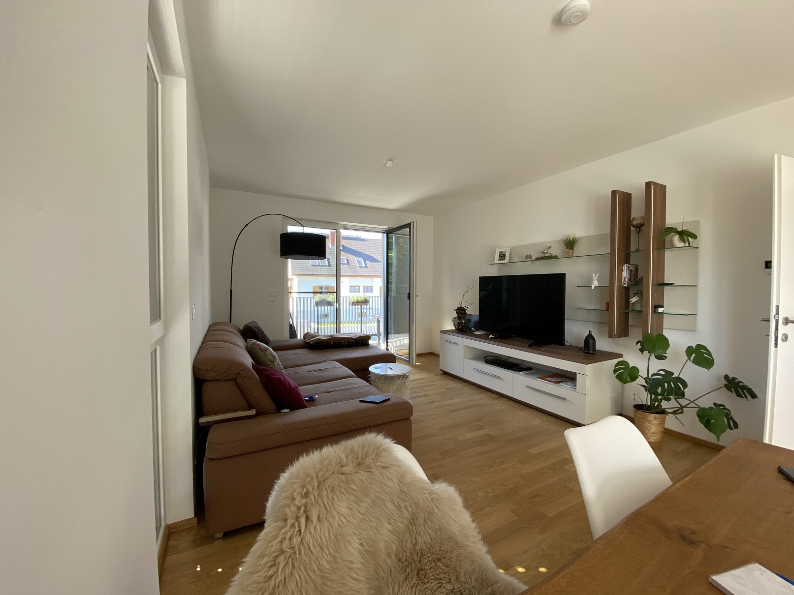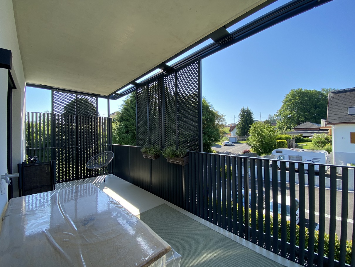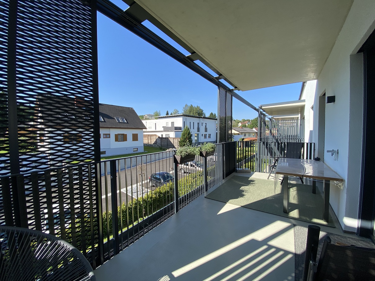 - Südseitiger Balkon (13,20 m²) mit verschiebbaren Beschattungspaneelen – individuell an den Sonnenstand anpassbar, für ein angenehm luftiges und schattiges Ambiente
