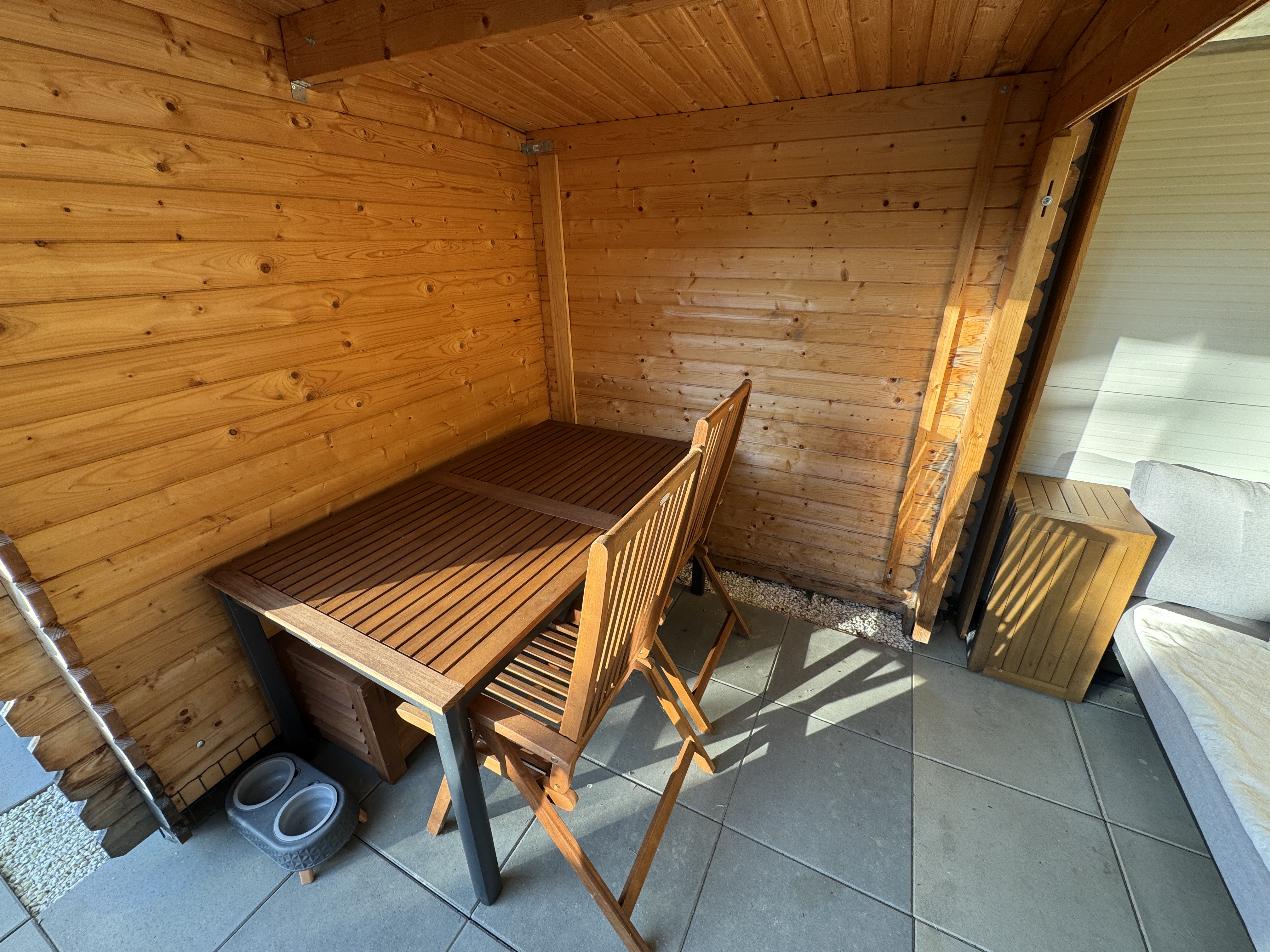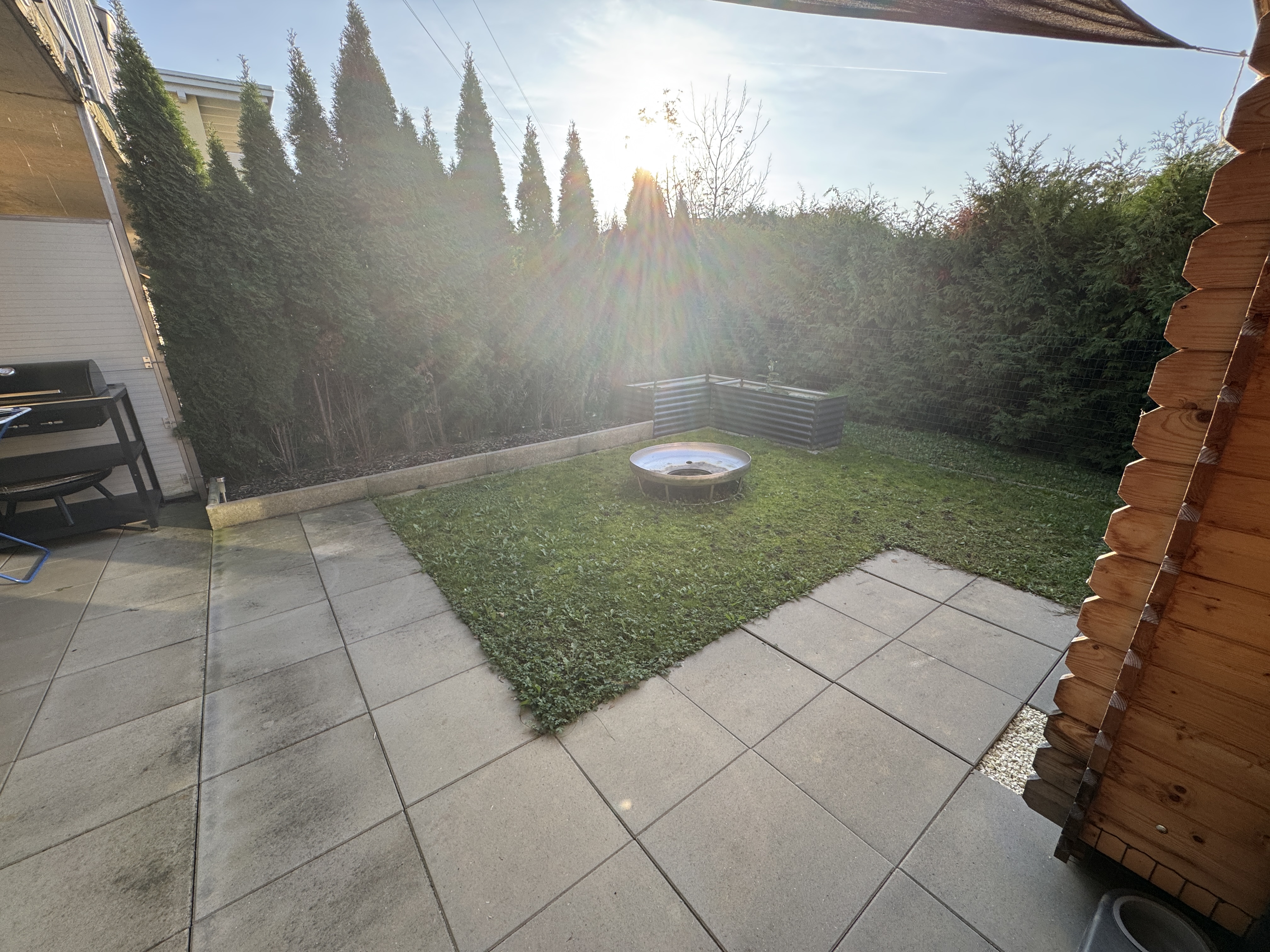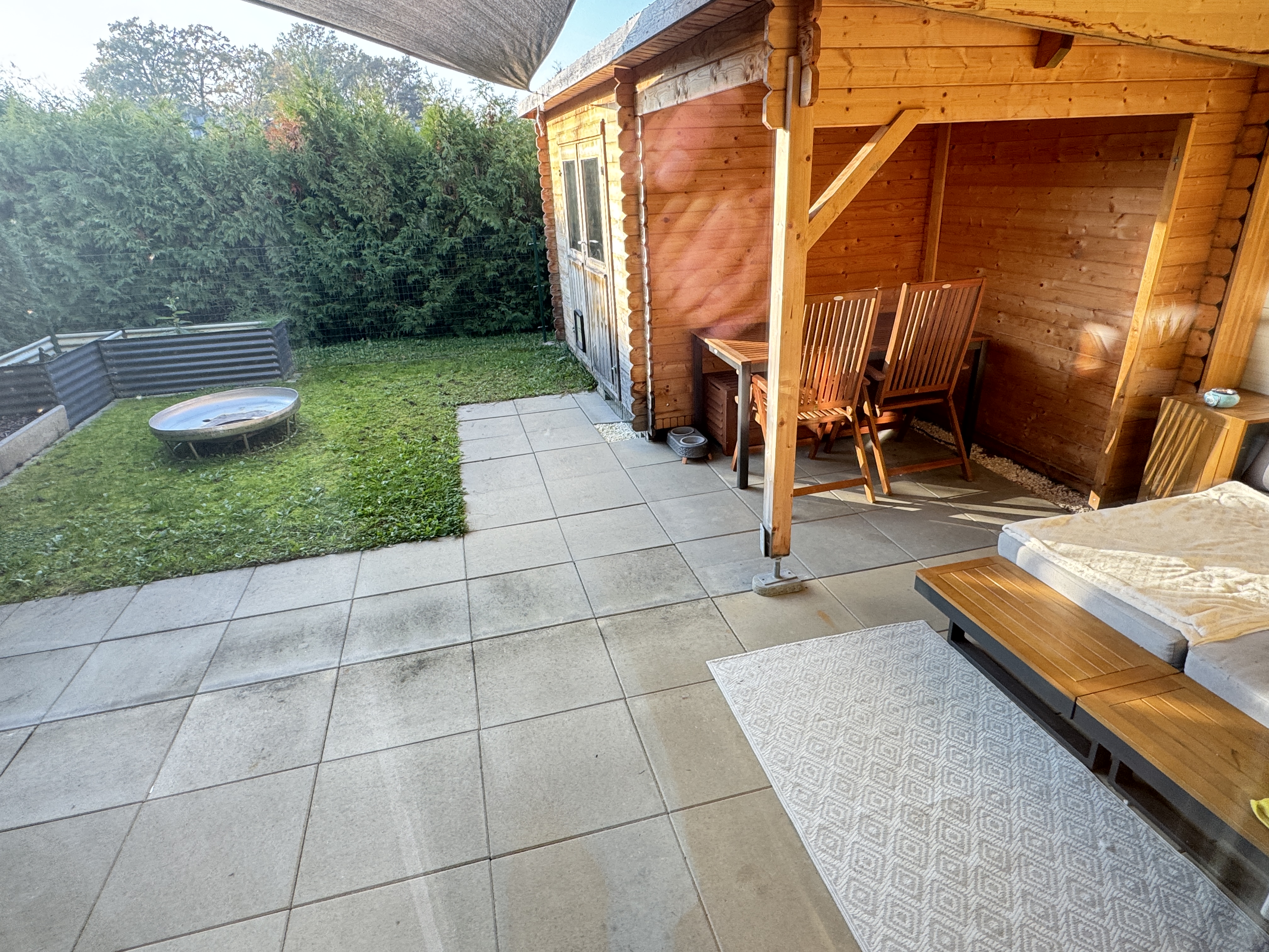 - Terrasse mit ca. 14,44 m² Garten mit ca. 56,94 m² inklusive Gartenhütte (Lagerraum)