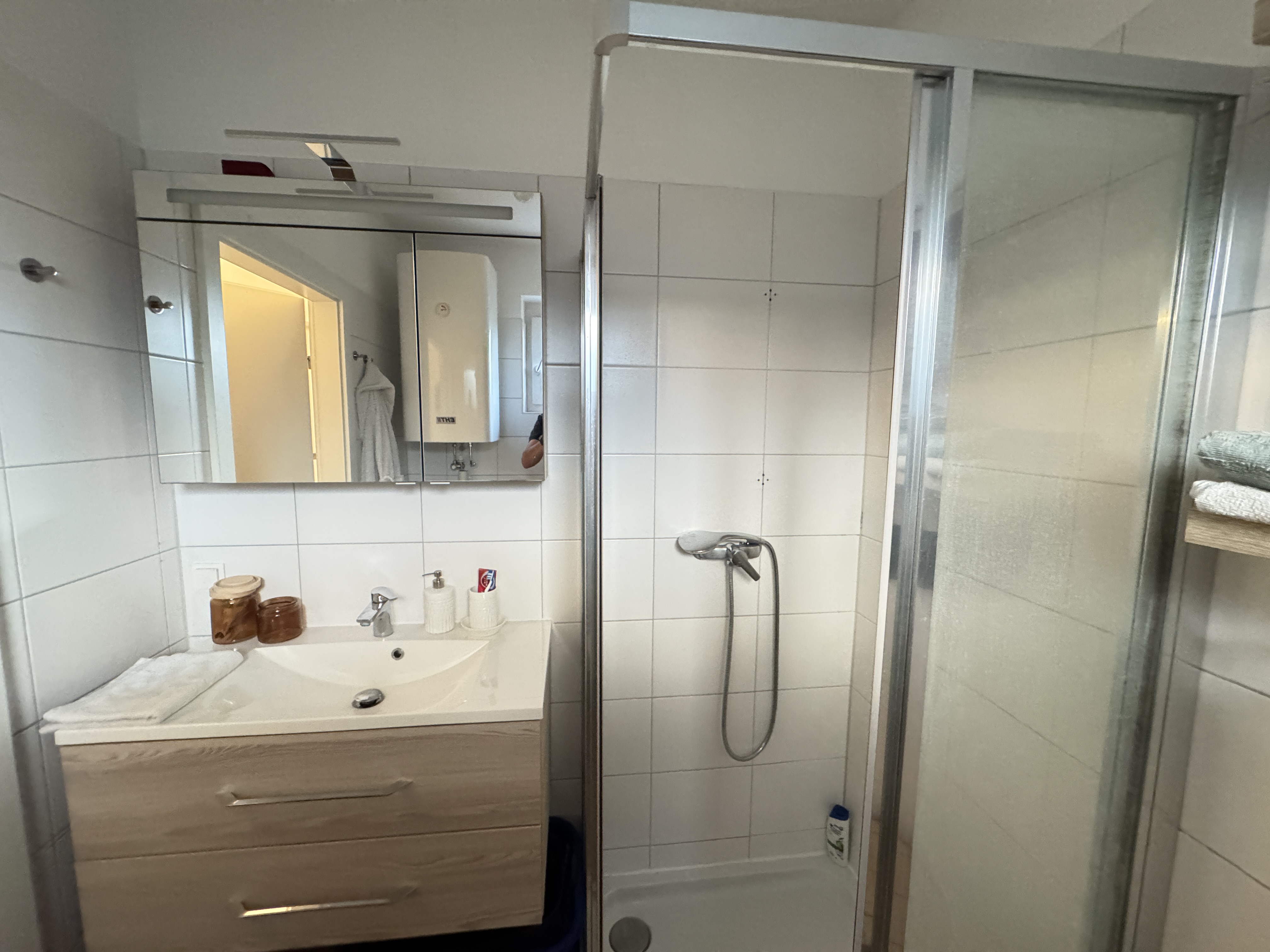 - Badezimmer mit Dusche, WC, Waschmaschinenanschluss und Fenster