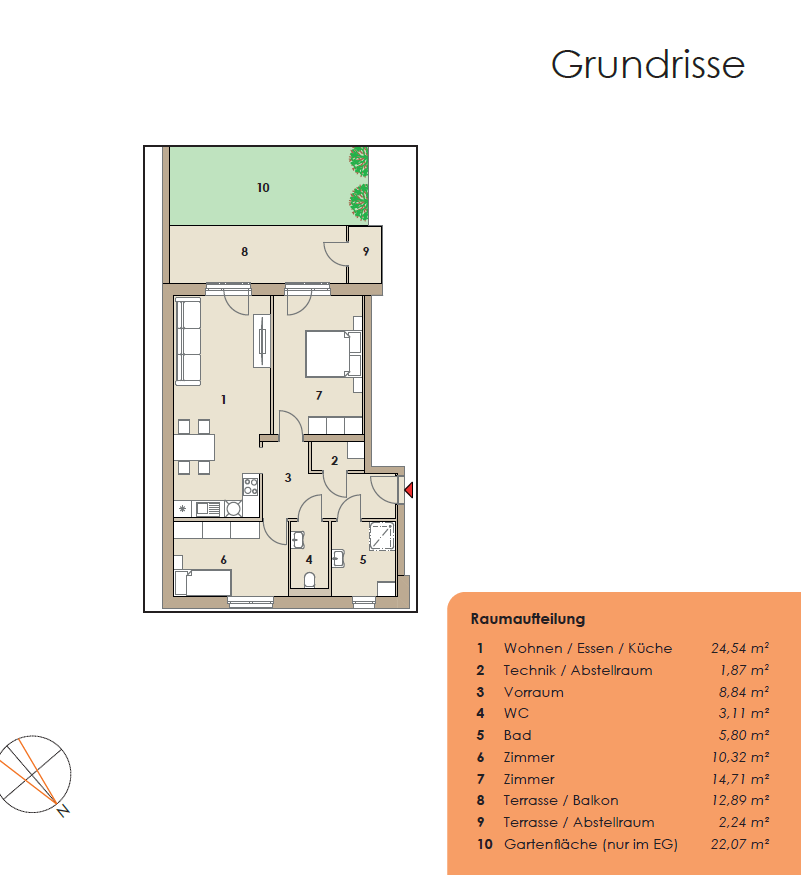 Die Wohnanlage wird in energieeffizienter Ziegelmassivbauweise errichtet und bietet eine gehobene, zeitlose Ausstattung, die langfristigen Wohnkomfort und niedrige Betriebskosten gewährleistet.