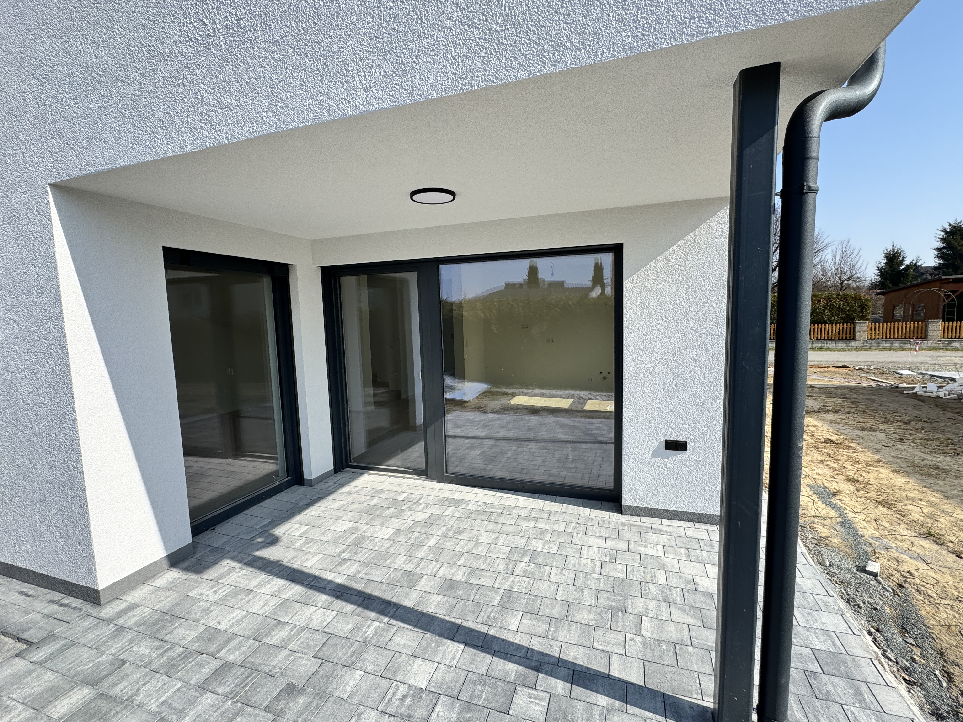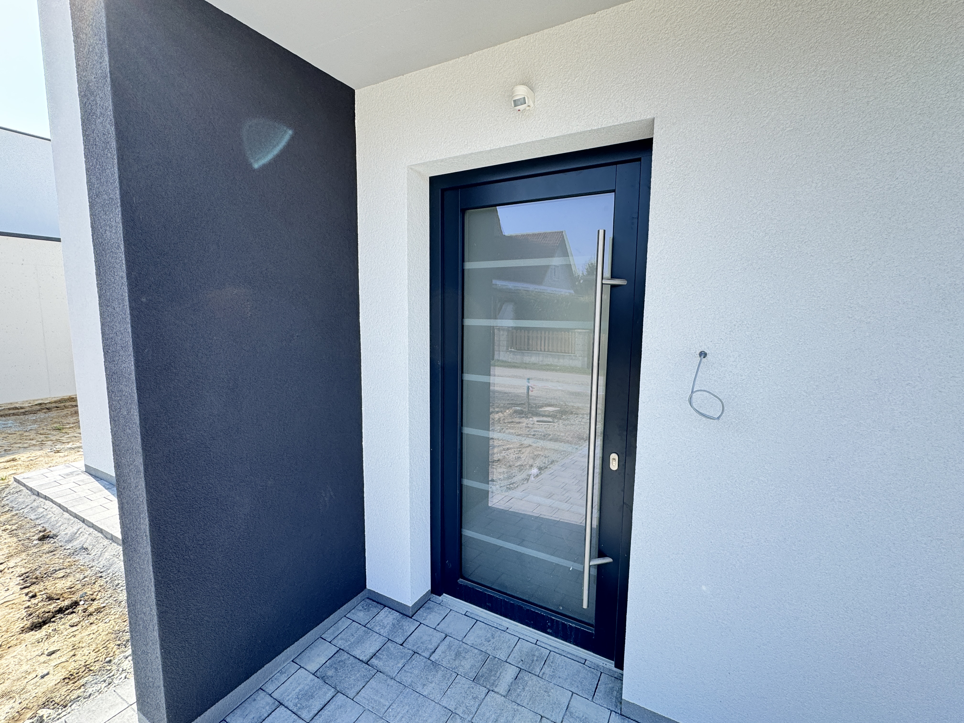 Die Eingangstür mit satiniertem Glaselement sowie die großen Fensterfronten wurden in Alu ausgeführt und entfalten sonnendurchflutete und helle Räumlichkeiten.