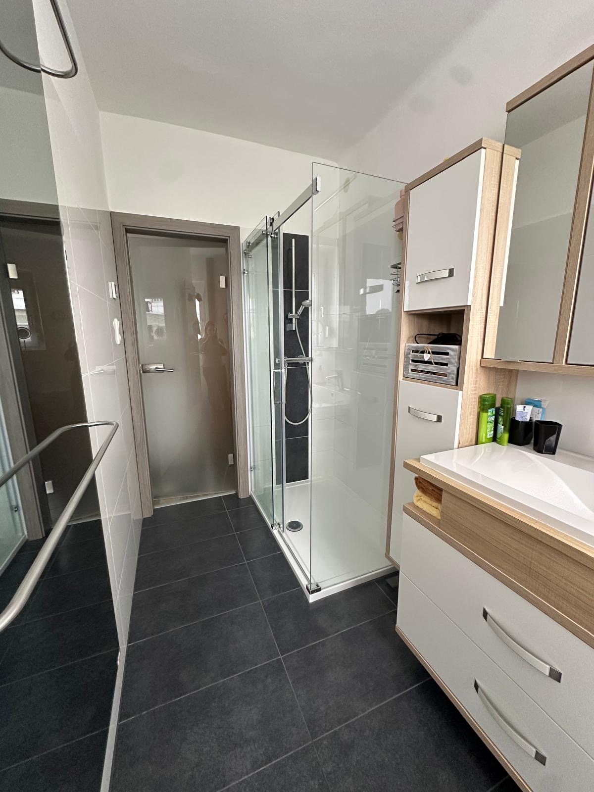 - Badezimmer mit Dusche, WC, Waschbecken und Fenster